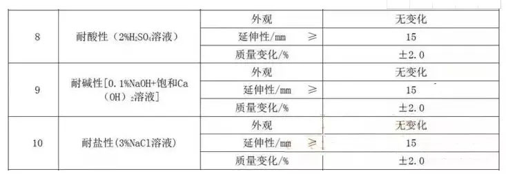 耐酸性、耐堿性、耐鹽性:耐酸、堿、鹽性反映了材料的抗腐蝕效果,通過外觀、延伸性和質量變化來表示,標準要求如下: